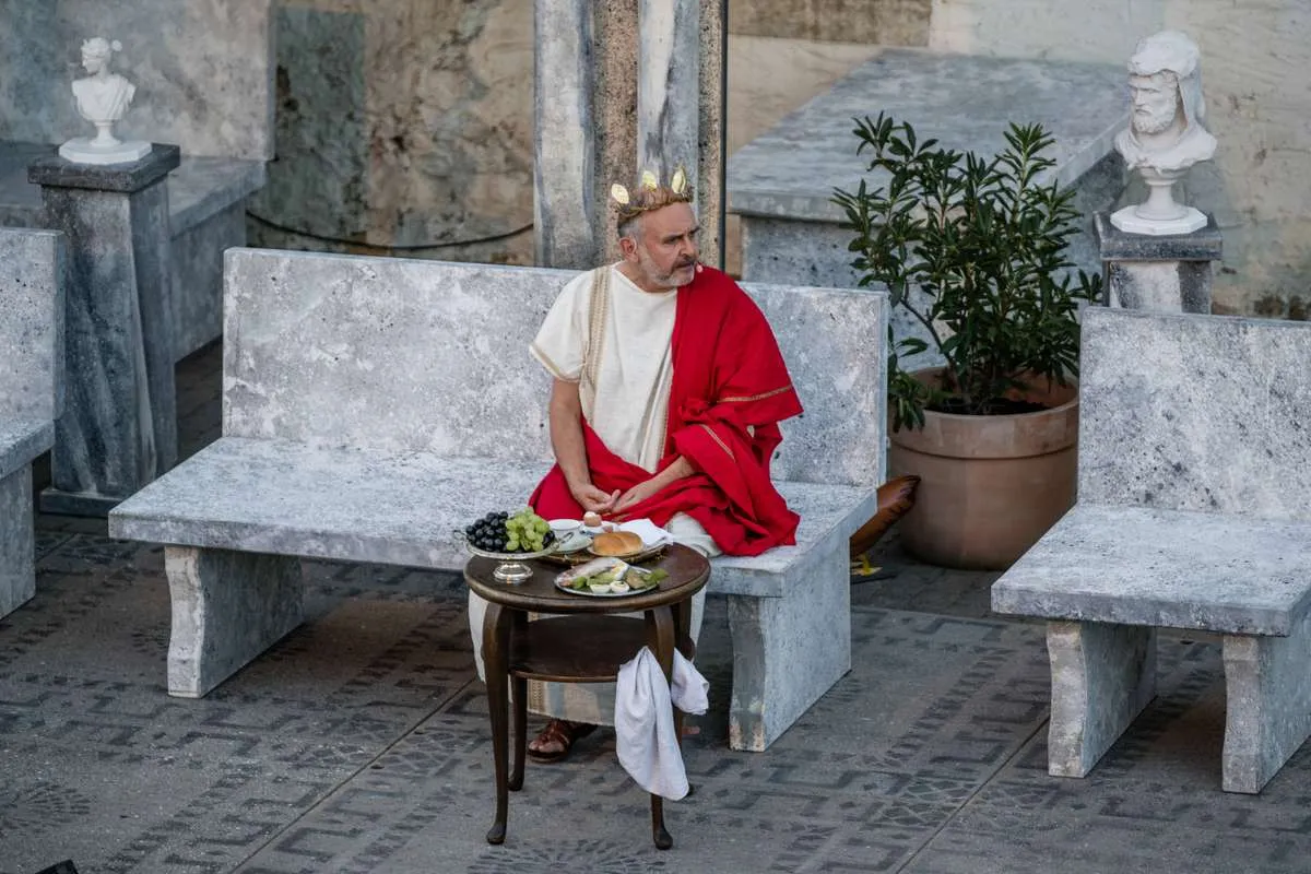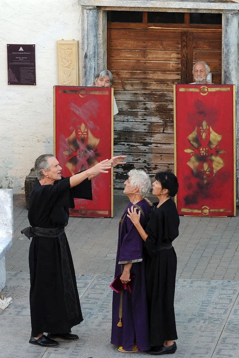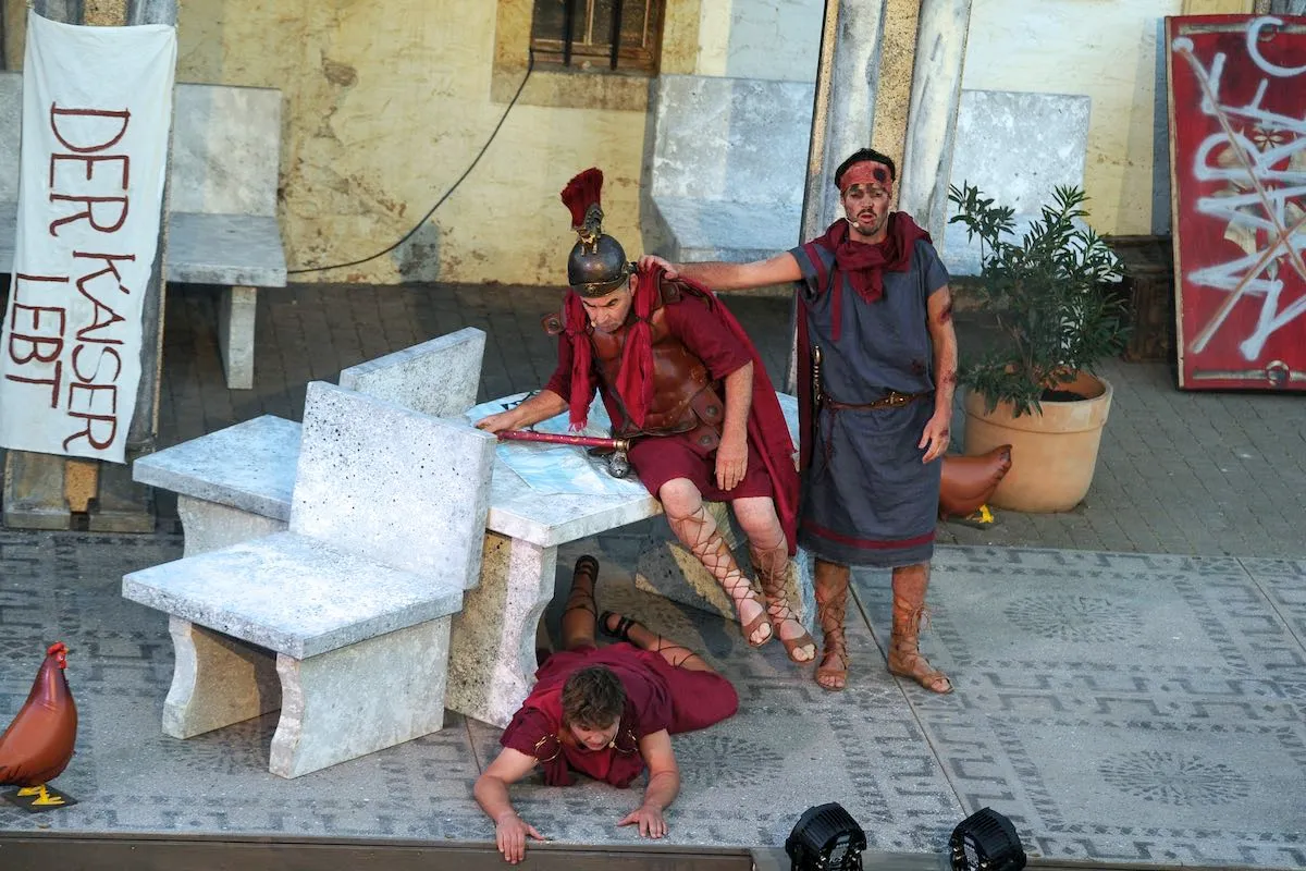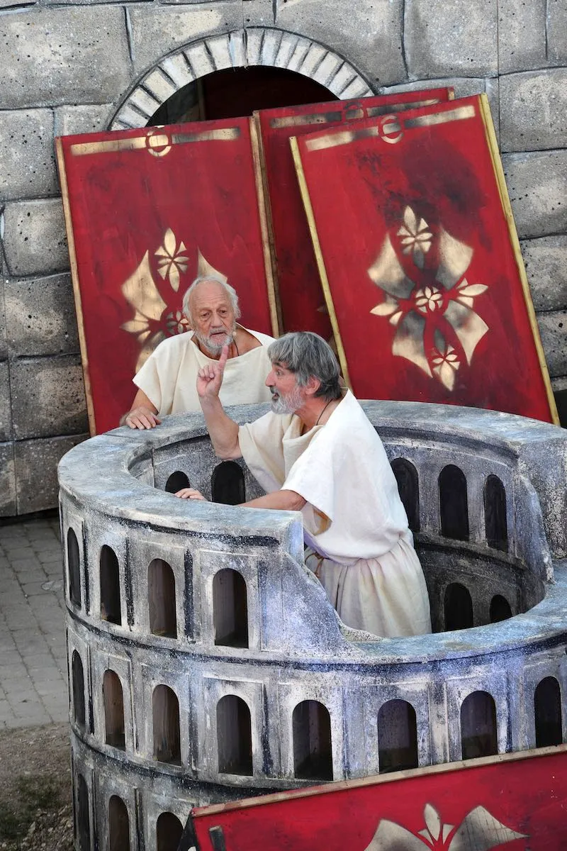 Das «Stück Romulus der Große» erzählt den Untergang des römischen Reiches. Rund 20 Darstellerinnen und Darsteller schlüpfen in die Toga und warten auf die anrückenden Germanen. Auf die Begegnung von Romulus mit dem Germanenfürsten Odoaker dürfen Sie gespannt sein! Dürrenmatt beobachtete die Vorgänge in der Politik stets aufmerksam, seine beissenden Kommentare waren von den Obrigkeiten gefürchtet und vom Volk geliebt. Am meisten kritisierte er die Ungerechtigkeiten der Grossmächte. Als hätte er das Stück für unsere Zeit geschrieben! Obschon der Inhalt ernst ist, lachen wir über die krausen Ideen der Leute am Hof, es ist, als hätten wir es mit lauter Hofnarren zu tun. Aber das Lachen vergeht auch immer wieder, wenn die Masken fallen.